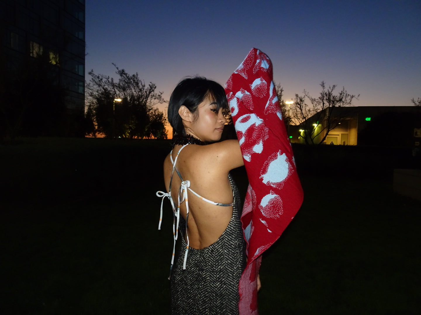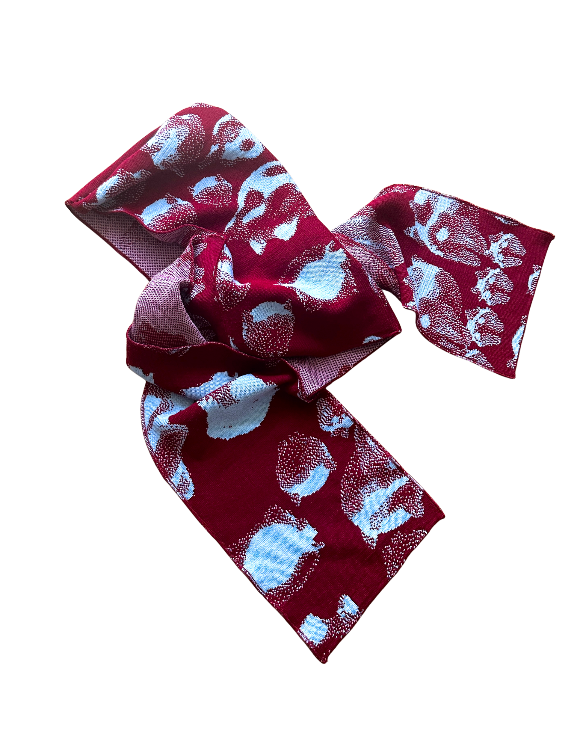 Special and perfect accessory. Hooded scarf in red cotton jacquard with Bunny design. Both structured and flexible to your needs. Made with cotton and constructed in L.A. Made to order! Delivered within 14 days.