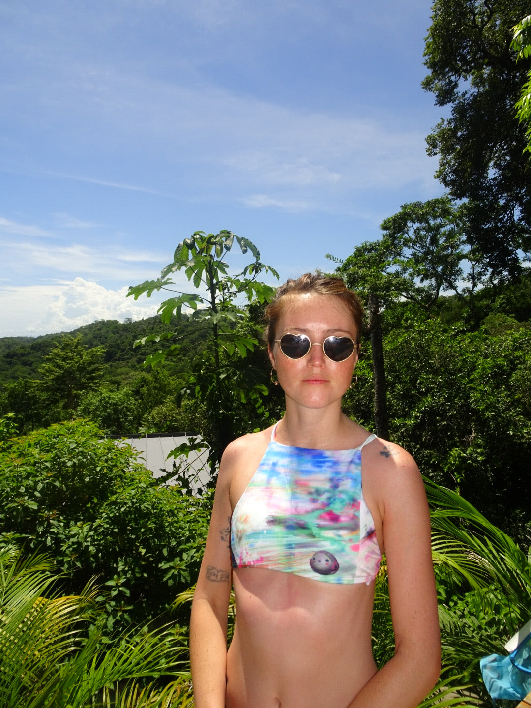 SUMMER '23 collection. Two piece with drawings all over. Top is high neck, strappy back. Super cheeky. Adjustable strings.