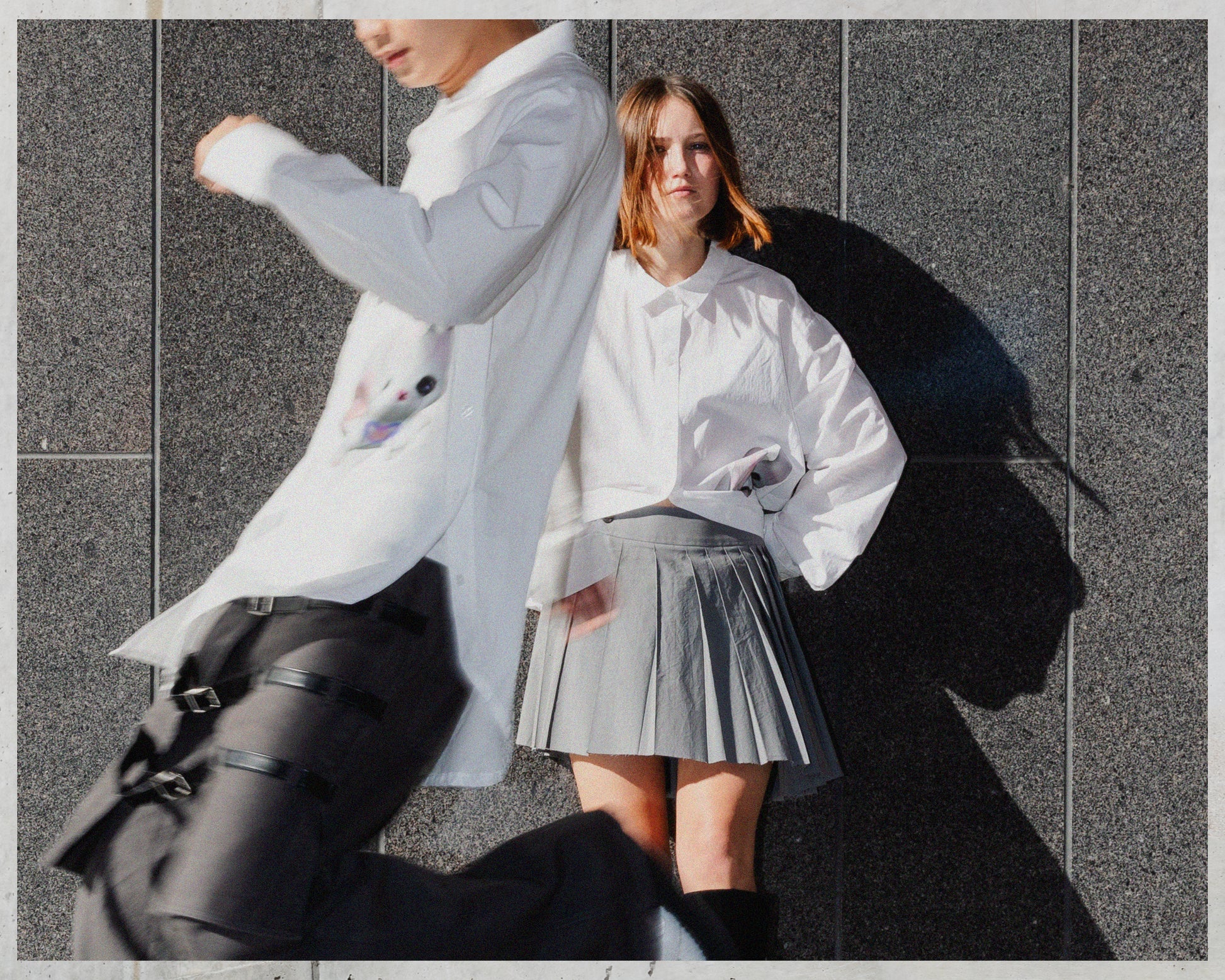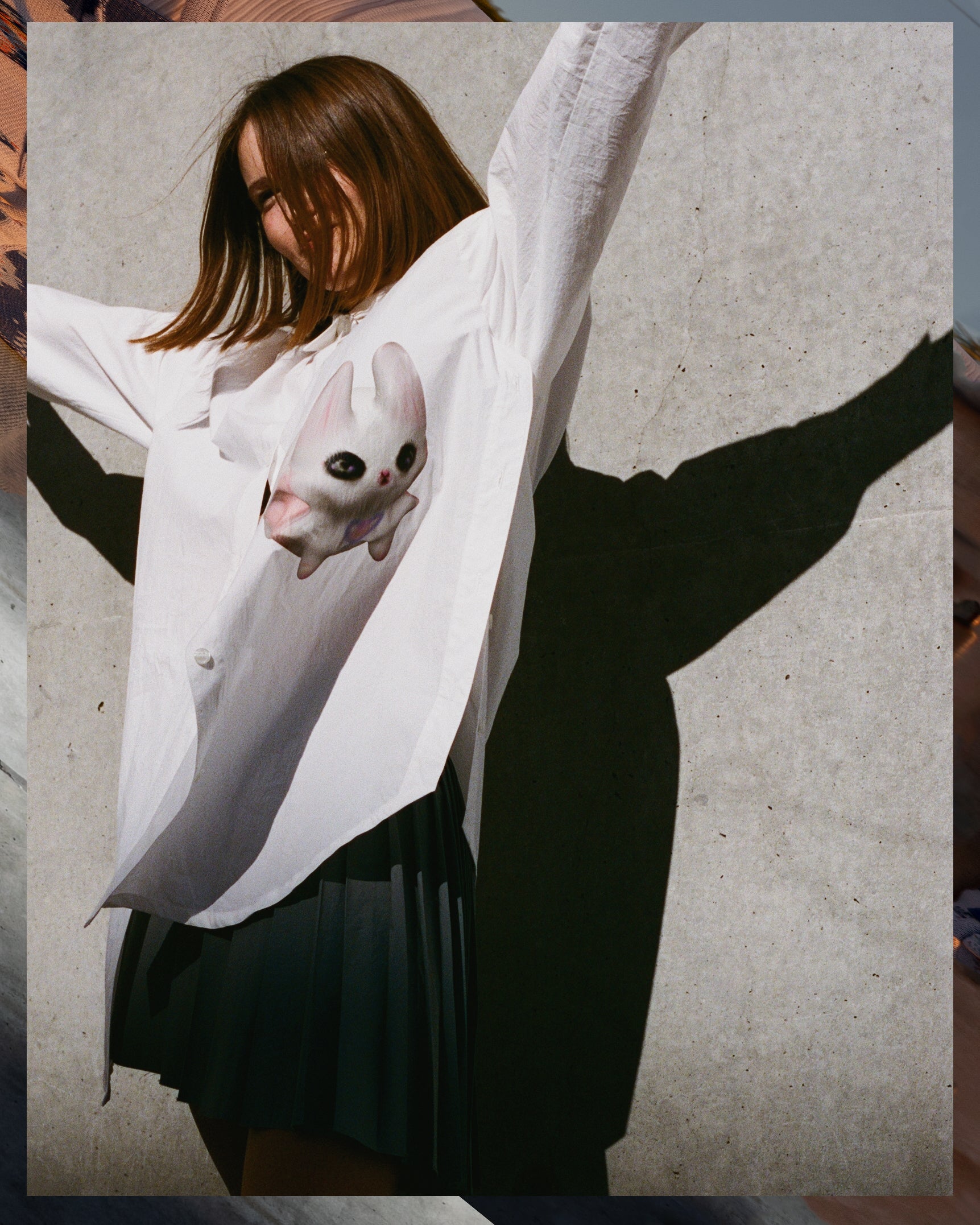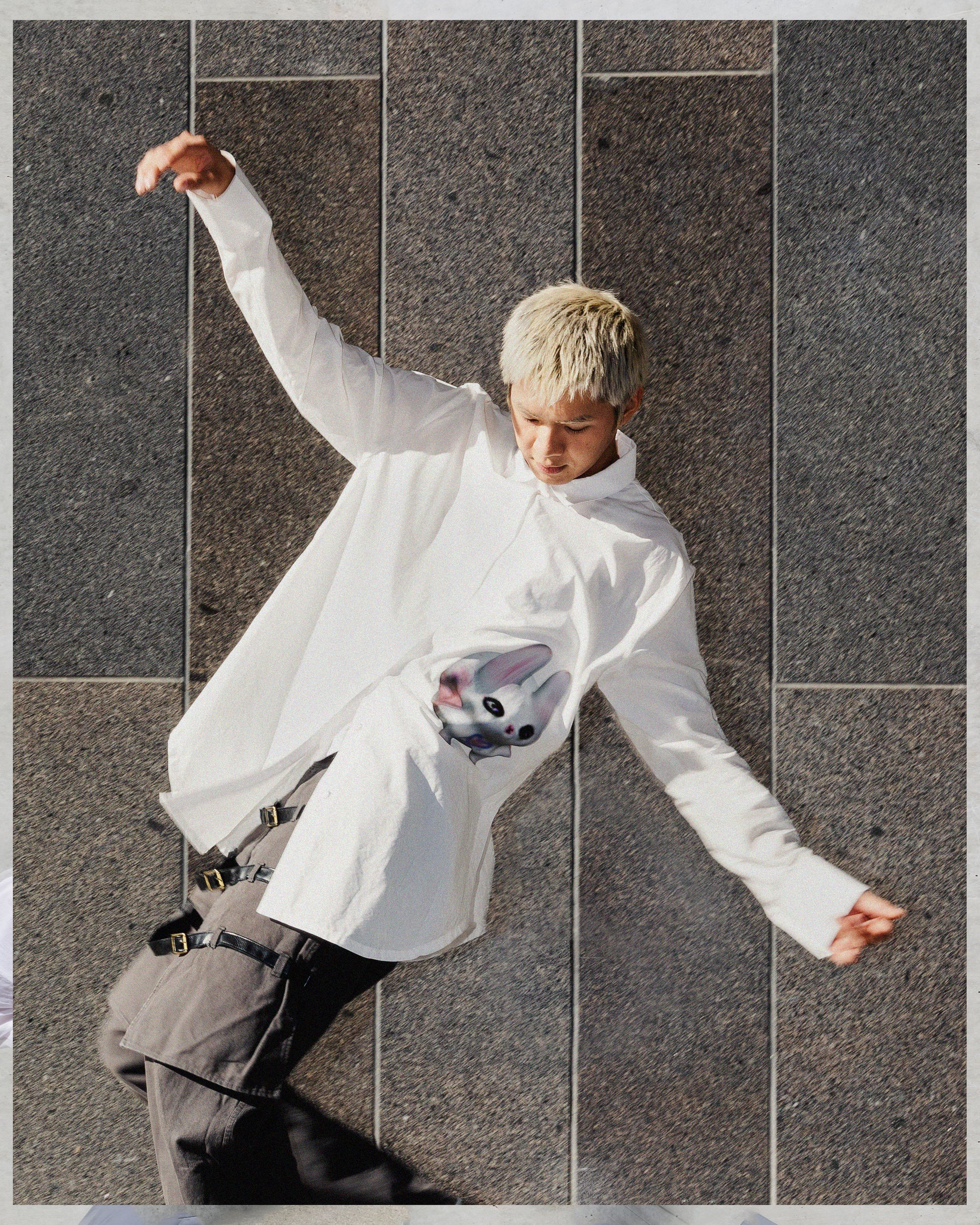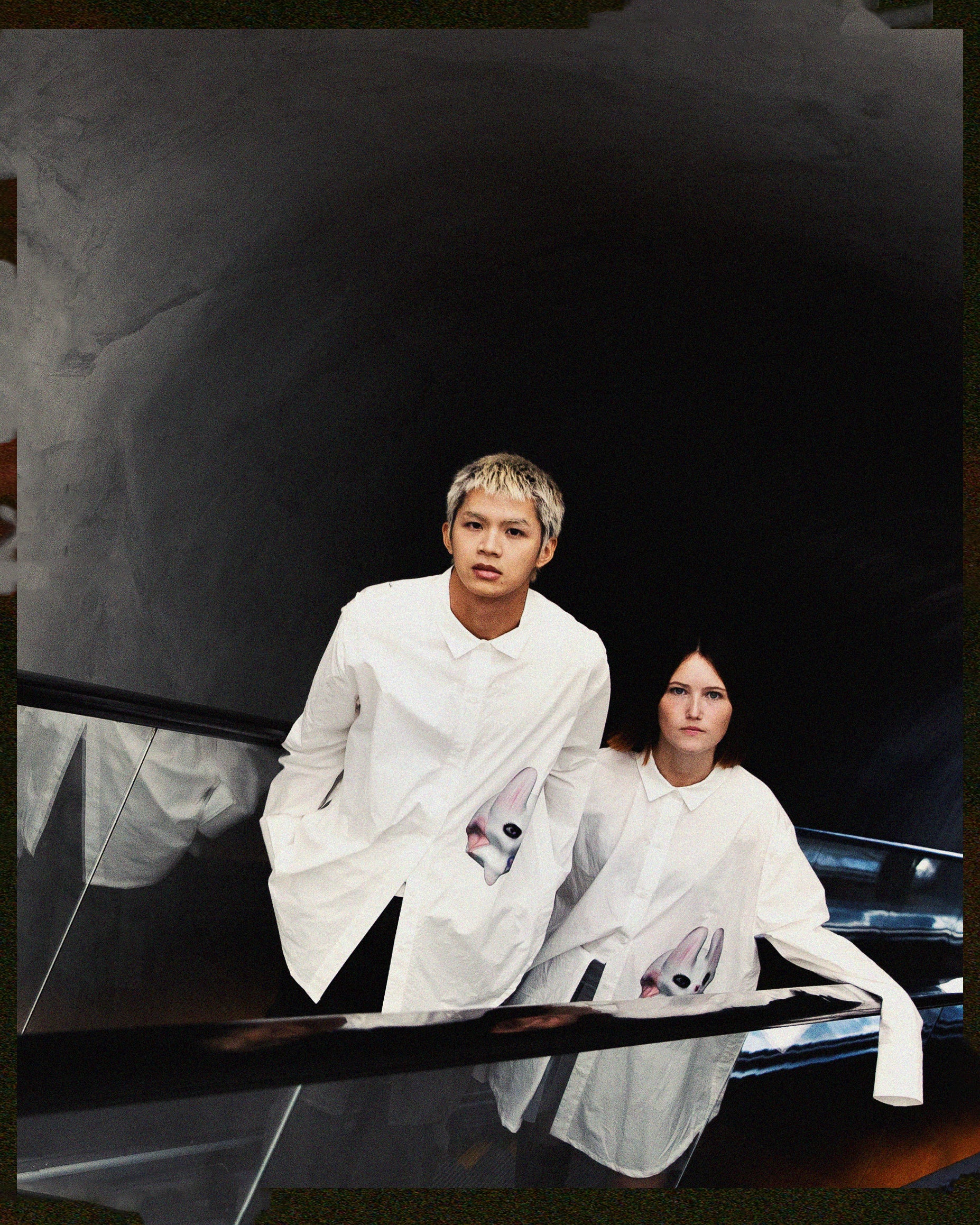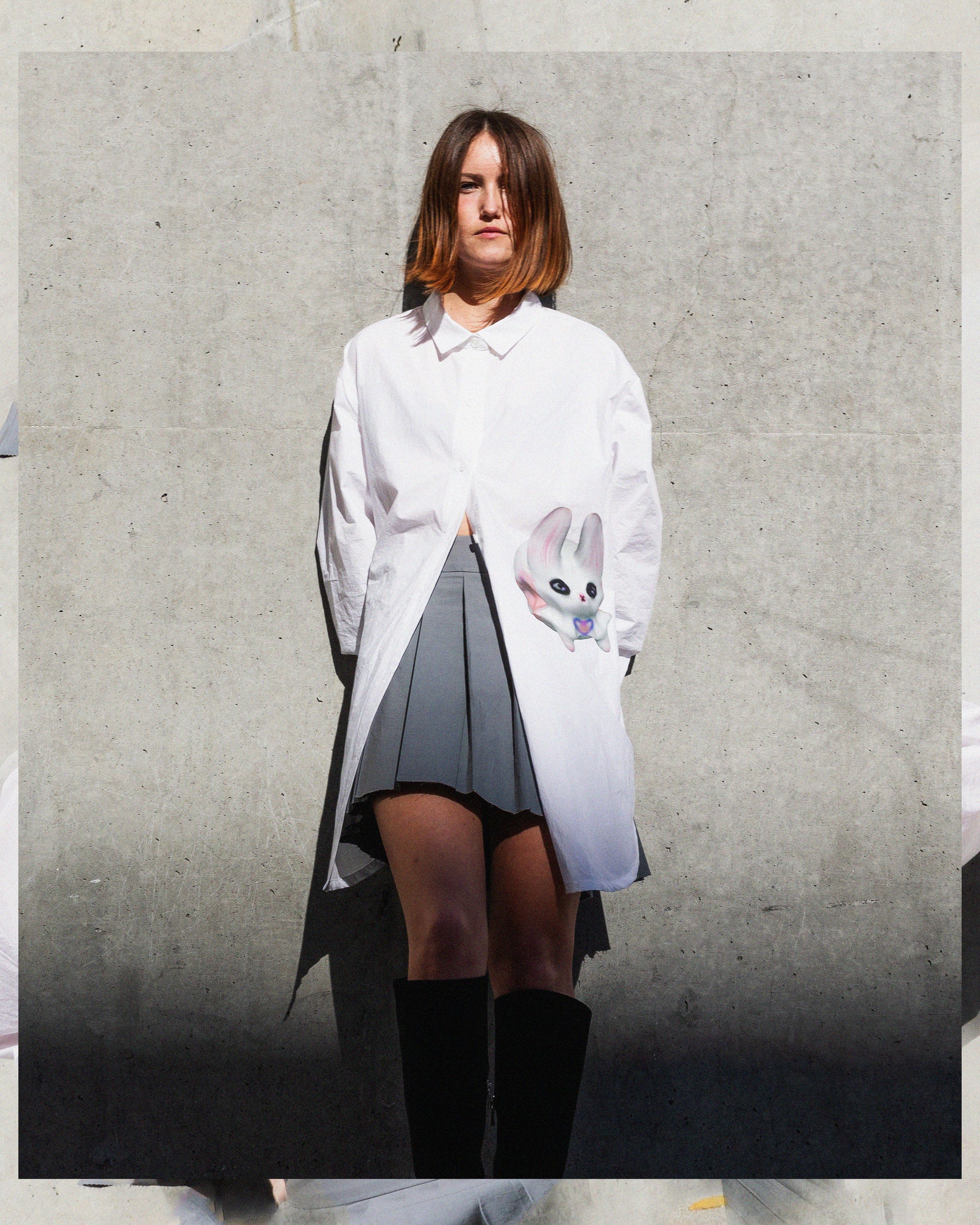 From minxcenter x VIHANGA collab 2023. Wardrobe staple, flexible fit. Vihanga craftsmanship meets minxcenter characters. Oversized fit and elongated side plackets with button closure. Extra small camp collar with character on the right side, and small detail on the right sleeve. Flower detail on the right shoulder. Last few left!
