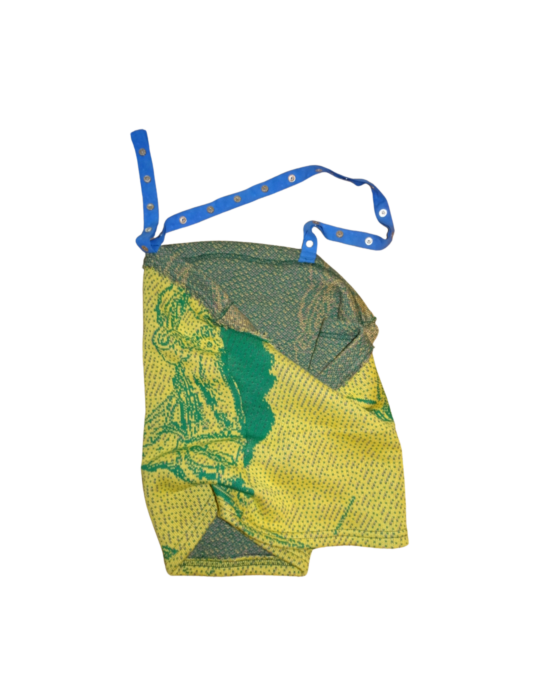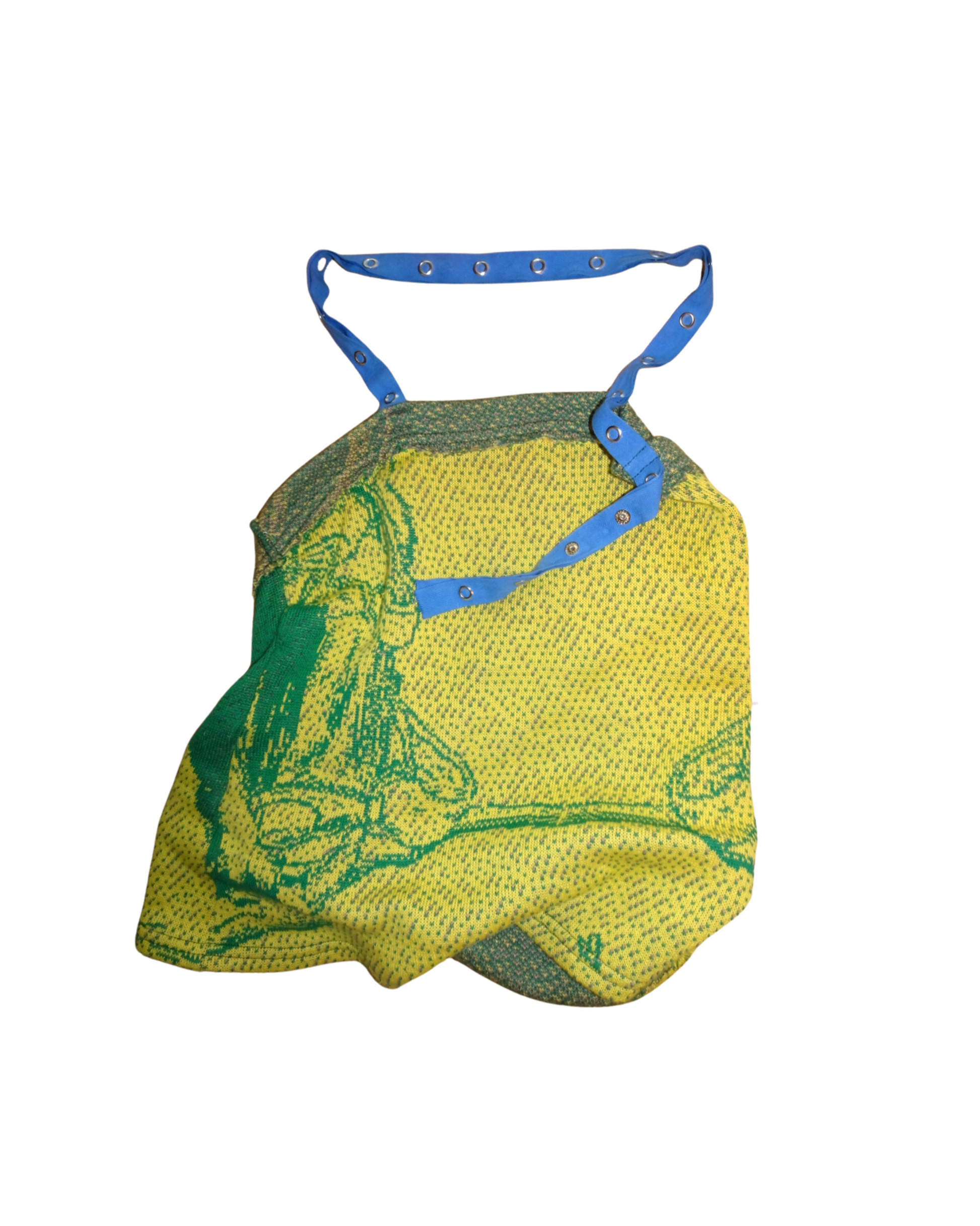 Yellow Knit Top with blue grommet strap. Cotton jacquard with slight stretch. This particular yellow has been fascinating me recently. Dress in this color coming in April!